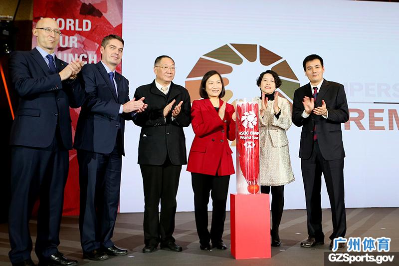 广州市政府副秘书长张建华在新闻发布会上致辞,感谢世界羽毛球联合会、中国羽毛球协会对广州的厚爱和信任;世界羽毛球联合会主席波尔-埃里克·赫耶尔·拉尔森在致辞中祝贺广州成功申办2018-2021世界羽联世界羽毛球总决赛。世界羽毛球联合会秘书长托马斯·隆德、商务总监欧文·里德, 中国羽毛球协会副秘书长冯平善, 广州市体育局副局长林燕芬、吴民春等出席新闻发布会。