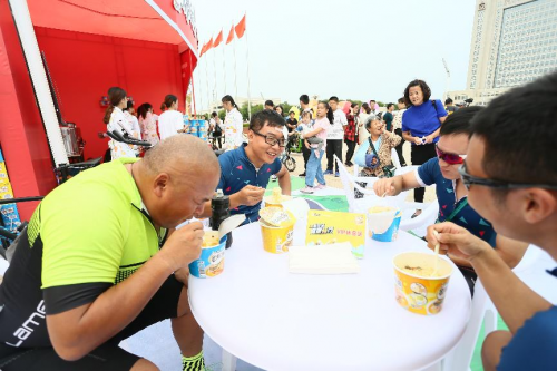 除了参赛选手以外,有不少围观的群众也被康师傅能量面馆所吸引,前来进行品尝。其中一位带着宝宝的女士表示“我自己是马拉松爱好者,这次是来陪丈夫参加自行车比赛的,赛后看到补给区出现了康师傅能量面馆非常亲切,在马拉松赛场上经常出现,没想到骑行赛事现在也有了泡面的补给,我和孩子都很喜欢吃”。