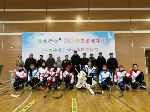 活动在安徽省体育局田径游泳运动管理中心副主任赵涛宣布本次活动开幕达到高潮。随后,与会领导在教练员的组织下,进行了旱地冰壶的体验,并与蚌埠市学海路学校冰球队合影留念。